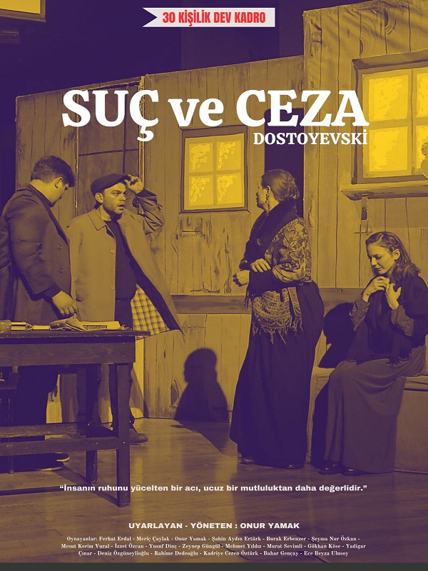 Crime and Punishment Theater Play Age Limit: 13+ Duration: 140 minutes / 2 Acts Adapted from Dostoevsky's famous work, "Crime and Punishment," which has been performed to sold-out audiences for 3 seasons, is staged with a cast of 30! "A pain that elevates the soul is more valuable than cheap happiness." – Dostoevsky How is a person considered guilty? Does crime begin when justice ends in Dostoevsky's view? While making Raskolnikov say "There is no real crime," did he himself believe it? According to Raskolnikov, a poor student, if it benefits society, one has the right to break free from the laws; this belief normalizes the breaking of laws. With this thought, as Raskolnikov kills the pawnbroker woman he believes harms society, the concepts of "crime" and "punishment" begin to be deeply discussed. Through Raskolnikov and other characters whose lives are built on dilemmas and inner conflicts as much as his, societal values are questioned and redefined. The concept known in the medical world as "Raskolnikov Syndrome" also comes from here: The effort to create one's own justice despite knowing one's power is insufficient. If a person has extraordinary thought and wisdom, do they have the right to commit a crime for the justice of society? Dostoevsky makes you question this through Raskolnikov's sufferings. Is there a real crime? If so, who gives the punishment? Adapted from Dostoevsky's magnificent work, "Crime and Punishment," is on tour in Turkey with a cast of 30! Event Type: Tragedy, Drama Duration: 140 minutes
