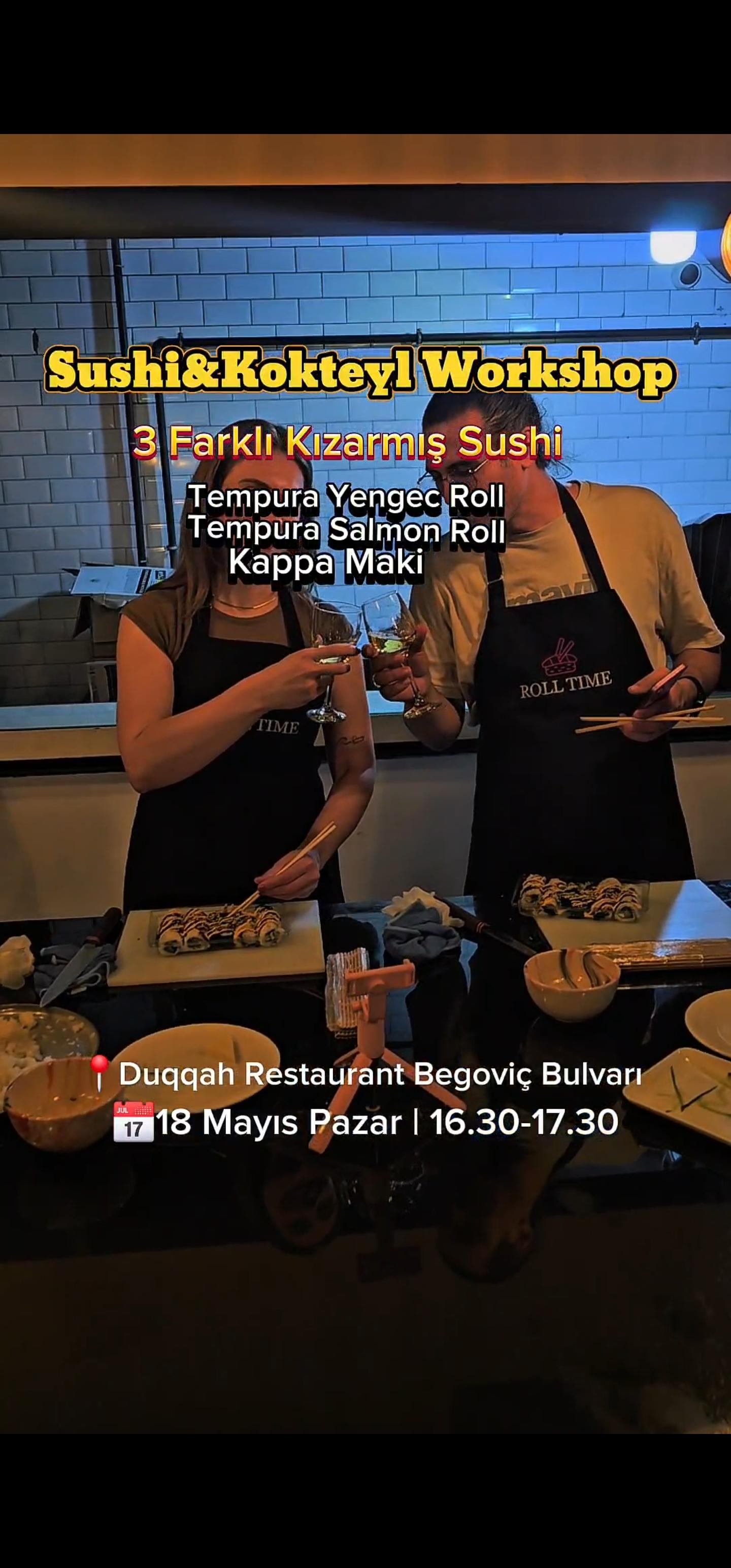 An Unforgettable Taste Experience Awaits You! No experience is required for our workshops! We provide all the ingredients—you just focus on making, enjoying, and tasting your creations. A delightful and educational workshop experience awaits you, hosted by Professional Chef Yasin Tanış and accompanied by Roll Time’s exquisite flavors. In this special event, you'll both craft delicious sushi hands-on and gain detailed knowledge about sushi. We’ll prepare 3 types of cooked sushi — a total of 24 pieces 🥢🍣: • Tempura Salmon Roll • Tempura Crab Roll • Kappa Maki (made with cucumber; not raw, not cooked) 🍷 Each participant will be served one non-alcoholic cocktail. 📅 Date: Sunday, May 18 ⏰ Time: 16:30–17:30 📍 Venue: Duqqah Restaurant, Begoviç Boulevard 💵 Price: 1350 TL A 450 TL deposit is required. If canceled at least 2 days in advance, it can be used for a future event. Otherwise, the deposit is non-refundable.