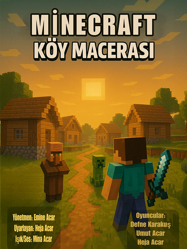 Minecraft Village Adventure - Theater Play Age Limit: 4+ The beloved game Minecraft is now on the theater stage with a new adaptation! This play, which develops children's imagination and tells a story of friendship, cooperation, and an adventure-filled world, will enchant little audiences with its colorful sets, lively characters, and entertaining dialogues. Steve, Alex, and their friends will test their courage on this journey full of dangers, discover the power of friendship, and show that being together can overcome any difficulty. Both entertaining and educational, this play will boost children's creativity while offering an enjoyable theater experience for families. 🧱 In a world built of blocks, dreams come alive on stage! 👦👧 Suitable for all children aged 4 and above. Directed by: Emine A. Kılınç Light/Sound: Mina Acar Adapted by: Heja Acar Cast: Defne Karakuş, Umut Acar, Heja Acar Event Type: Children's Play