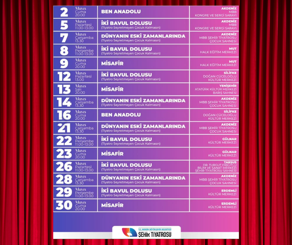 - MBB Şehir Tiyatrosu Mayıs Programı - Mersin MM City Theater May Program - Майская программа Городского театра муниципалитета Мерсина |