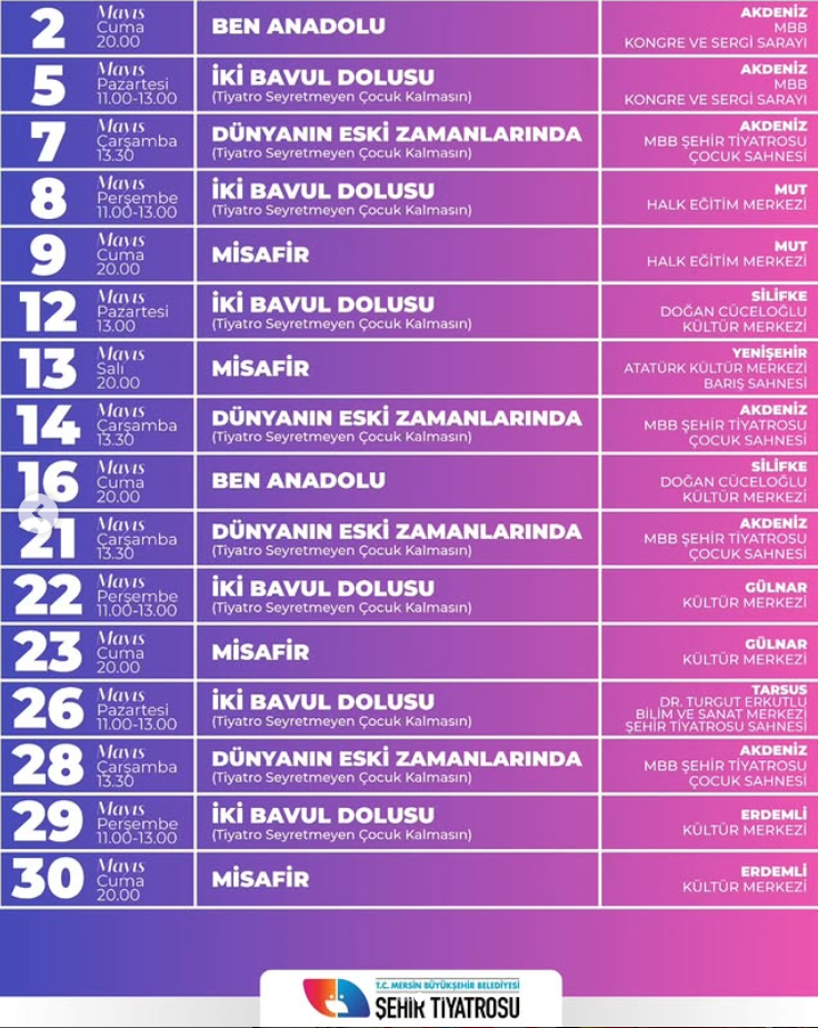 Tickets can be purchased via biletinial.comor at our event box offices. 📌 Ticket price for adults: 30 TL, Discounted ticket price: 10 TL. 📌 Ticket price for children's plays: 10 TL. (Families attending with their children also need to purchase separate tickets.) 📌 A 50% discount is applied for group ticket purchases (50 people or more). 📌 Free admission is available for the spouses and children of martyrs and veterans, individuals with physical disabilities, citizens over 65, nursing home and orphanage residents, and conservatory students. (ID verification is required.) 📌 On special occupational days (e.g., Doctor's Day, Teacher's Day), performances can be watched for free with prior reservation. 📌 Ticket control will be carried out at the entrance to the venue. 📌 Audiences will not be allowed to enter the venue after the performance begins. 📲 For detailed information, please contact us at +90 539 586 76 41. Ticket control is performed at the entrance to the hall. Audience members will not be admitted once the performance has started. For detailed information, you can contact us at 0539 586 76 41.
