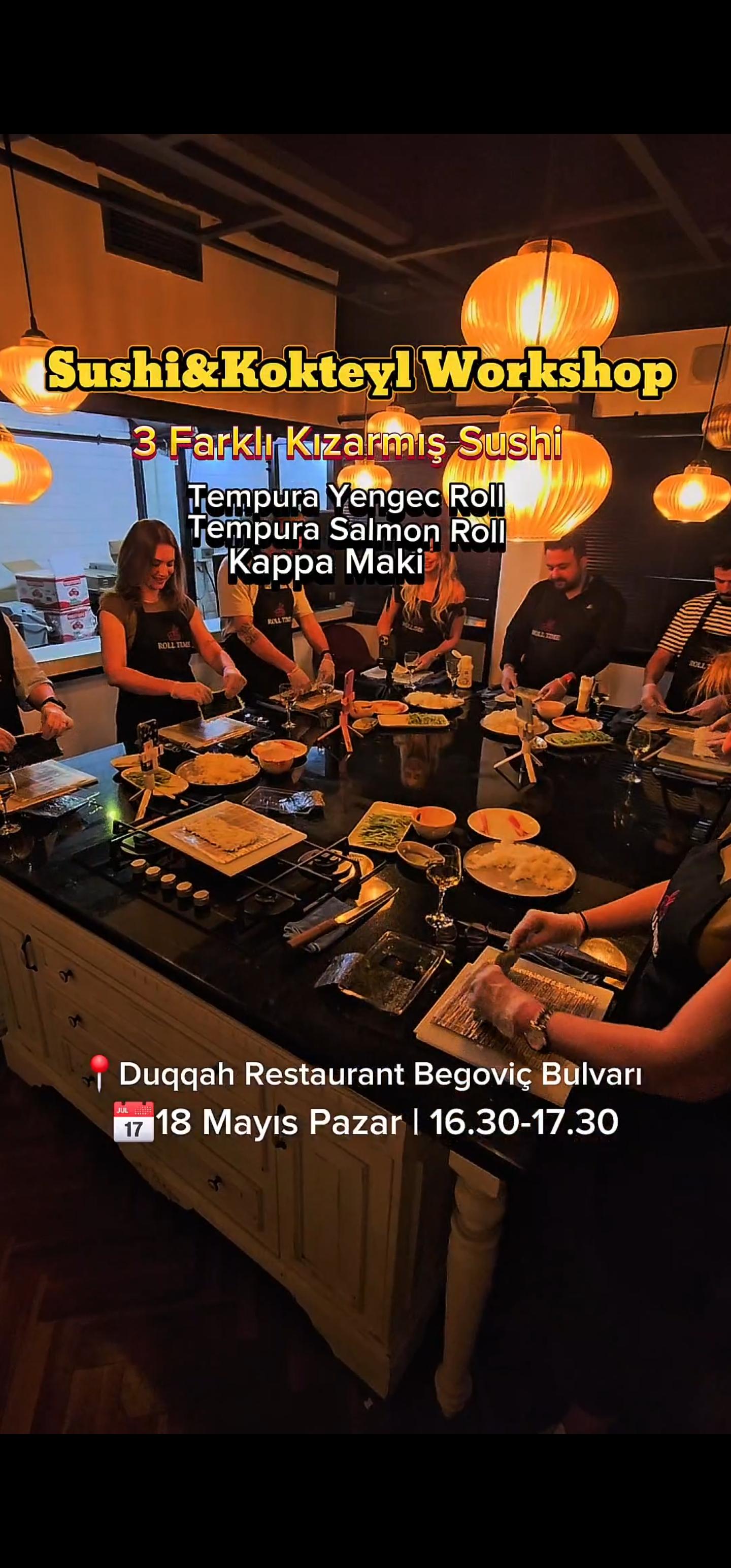 An Unforgettable Taste Experience Awaits You! No experience is required for our workshops! We provide all the ingredients—you just focus on making, enjoying, and tasting your creations. A delightful and educational workshop experience awaits you, hosted by Professional Chef Yasin Tanış and accompanied by Roll Time’s exquisite flavors. In this special event, you'll both craft delicious sushi hands-on and gain detailed knowledge about sushi. We’ll prepare 3 types of cooked sushi — a total of 24 pieces 🥢🍣: • Tempura Salmon Roll • Tempura Crab Roll • Kappa Maki (made with cucumber; not raw, not cooked) 🍷 Each participant will be served one non-alcoholic cocktail. 📅 Date: Sunday, May 18 ⏰ Time: 16:30–17:30 📍 Venue: Duqqah Restaurant, Begoviç Boulevard 💵 Price: 1350 TL A 450 TL deposit is required. If canceled at least 2 days in advance, it can be used for a future event. Otherwise, the deposit is non-refundable.