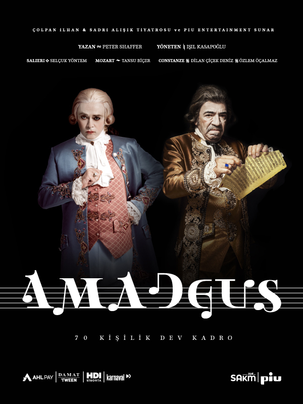 Amadeus – The Musical Age Limit: Suitable for audiences aged 12 and above. Duration: 2 hours 30 minutes (including intermission) Written by Peter Shaffer, AMADEUS tells the unforgettable story of two of the world’s most iconic composers—Wolfgang Amadeus Mozart and Antonio Salieri—and returns to the stage for its 6th season! Directed by the renowned Işıl Kasapoğlu, this co-production by Çolpan İlhan & Sadri Alışık Theatre and Piu Entertainment continues to captivate theatre lovers. Starring Selçuk Yöntem as Antonio Salieri and Tansu Biçer as Wolfgang Amadeus Mozart, Amadeus is one of the most talked-about productions of the season, featuring a massive 70-person cast. For 5 seasons, it has played to sold-out audiences, reaching over 400,000 spectators! Some of the awards Amadeus has received: 2022 Afife Theatre Awards – Haldun Dormen Special Award XX. Direklerarası Audience Awards: Best Director: Işıl Kasapoğlu Lifetime Excellence: Selçuk Yöntem Best Production: Çolpan İlhan & Sadri Alışık Theatre and Piu Entertainment GQ Turkey Men of the Year 2022 – Dazzling Achievement Award Amadeus has also made marketing history with the world’s first playable font, earning numerous accolades in advertising: 6 Crystal Apple Awards 4 Felis Awards ADC 100th Annual Awards – Best Logo Design Genre: Tragedy Duration: 150 minutes