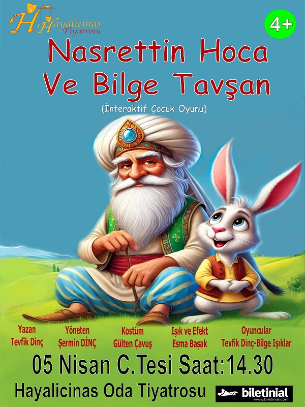 Nasrettin Hoca ve Bilge Tavşan Tiyatro Oyunu Yaş Sınırı: 4+ Kaybolan eşeği Karakaçan'ı arayan Nasrettin Hoca girdiği mağradan zaman geçidine ulaşır ve 2025 yılına gelir. Bilge Tavşan ile tanışan hoca yeni arkadaşıyla Karakçan'ı fıkralarla ve bilmecelerle aramaya devam eder. Etkinlik Türü Çocuk Oyunu Süre 40 dakika