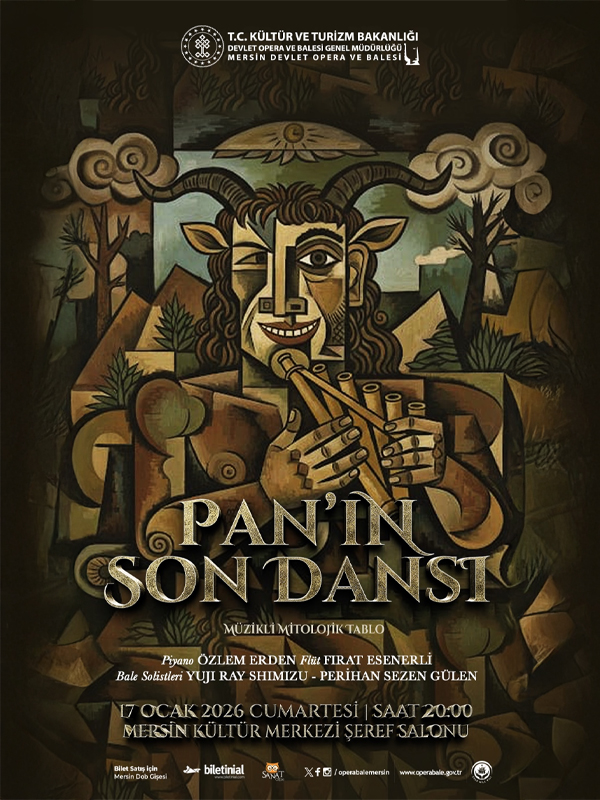 Pan's Last Dance - Mersin DOB PAN - The Last Dance is a 30-minute contemporary stage performance that reenacts the transformation of a mythological figure across ages, revolving around the axes of birth, desire, freedom, disappearance, and rebirth. The project does not merely retell the myth of Pan and Syrinx; it transforms this ancient story into a contemporary ritual that carries it to today's ontological questions through body, breath, light, and sound. This work unites three main states of humanity's relationship with nature on the same stage: Existence, desire, and nothingness. Pan's primal freedom, Syrinx's escape, and the transformation by the riverside are reconstructed on stage through the corporeal dramaturgy of two dancers, the breath-based existence of the flute, and the spatial harmony of the piano. Through digital sound textures, fragments taken from epigrams, and minimal visual materials, the story is transported into an organic atmosphere that penetrates the audience's subconscious. The form of the performance blurs the boundaries of theater, dance, concert, and visual arts. Neither fully a concert, nor a dance piece, nor a dramatic narrative... This work is a contemporary space of existence that allows a myth to breathe again on stage. The journey extending from Pan's birth to his extinction breaks the sense of daily time, turning the audience into witnesses of a ritual. Syrinx transforming into reeds and Pan making a flute from them ceases to be just a told story in the final moments; it evolves into a musical and visual ceremony. The flute melody accompanies the melting of Pan's body on stage, establishing the finale of the piece. Event Type: Musical Mythological Tableau